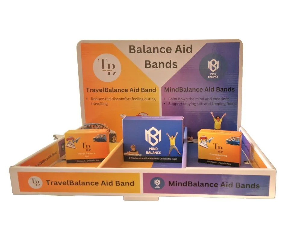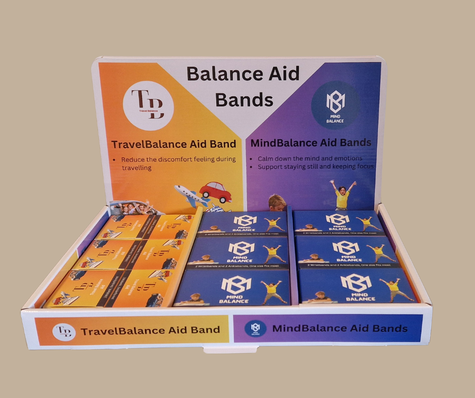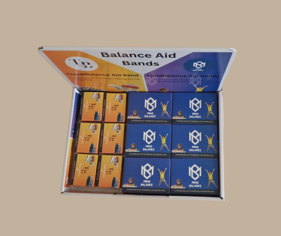 Display box 1 – 6 MindBalance Aid Bands and 6 Travel Balance Aid Bands